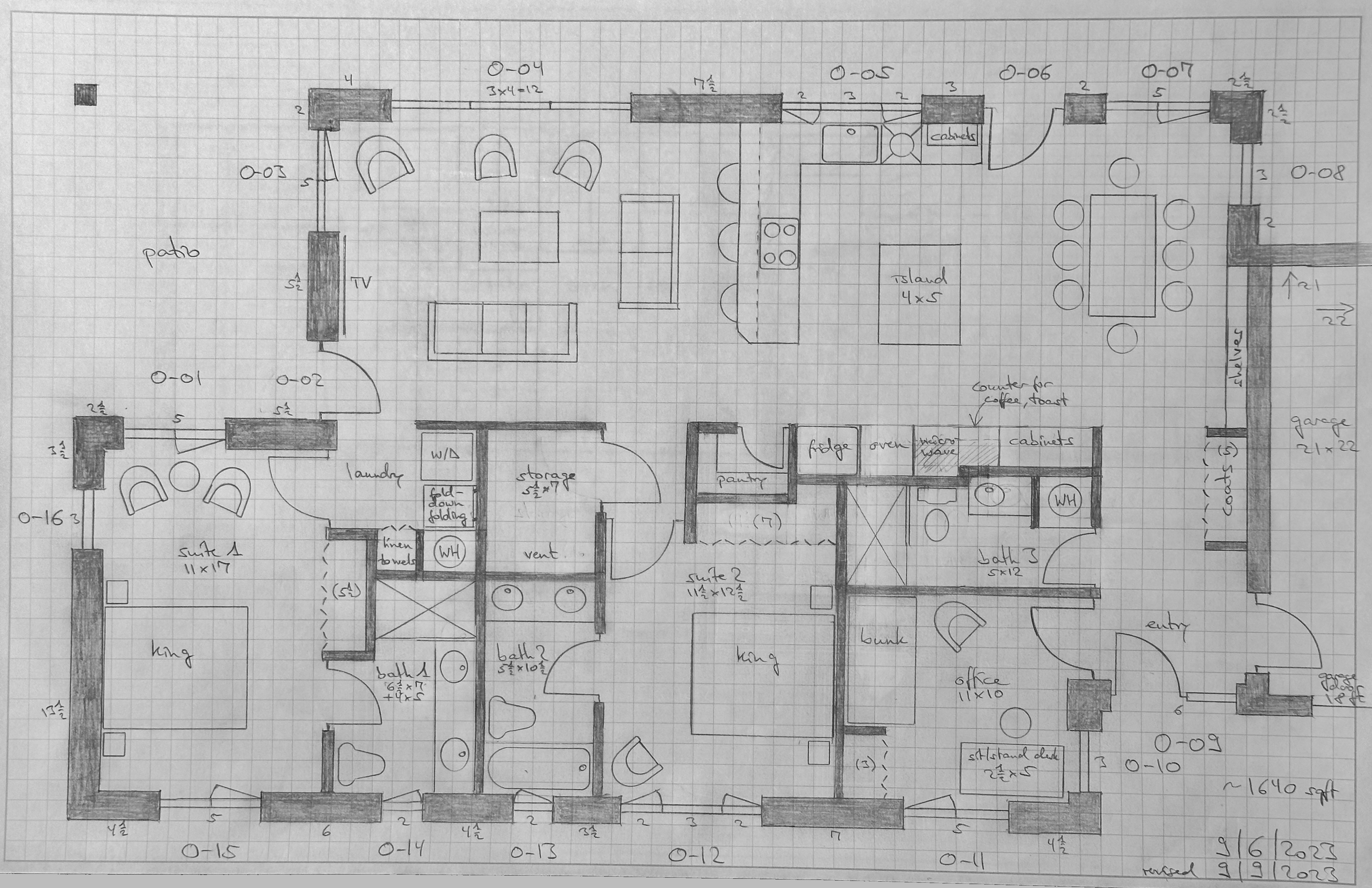 The new design also allows for a much simpler roof (just two rectangles), and reduces the number of outside corners from 18 to 10. The floor plan has gone through a number of revisions, and starts to look reasonably solid, but will surely change before it’s final. Here’s a sketch of what the new plan looks like right now (as I’ve mentioned before, this low-tech method works for me).